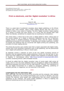 "This article takes a critical look at the print vs digital debate in Africa, taking stock of the current position as it relates to electronic publishing and the use of electronic reading devices in (English-speaking) sub-Saharan Africa, and the rapidly changing publishing environment on the contine