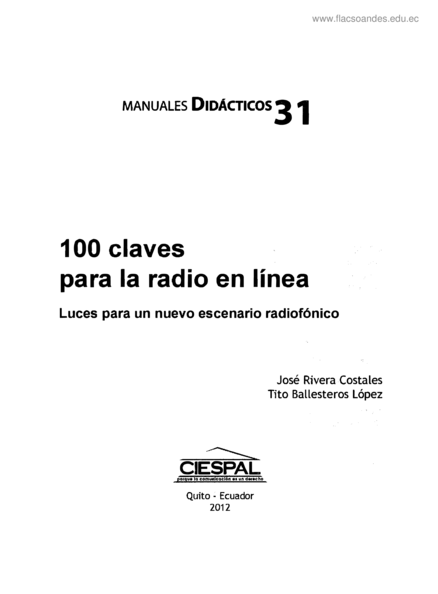 "En esta publicación, dos apasionados del medio sonoro, uno ecuatoriano y otro colombiano, presentan una serie de sugerencias y recomendaciones para los productores de radio en el nuevo entorno virtual. Los autores analizan algunos aspectos para hacer radio por internet. Las ventajas y desventajas son abordadas con un lenguaje sencillo y amigable, así como el uso de las nuevas plataformas digitales y redes sociales para la difusión radiofónica." (Cubierta del libro)