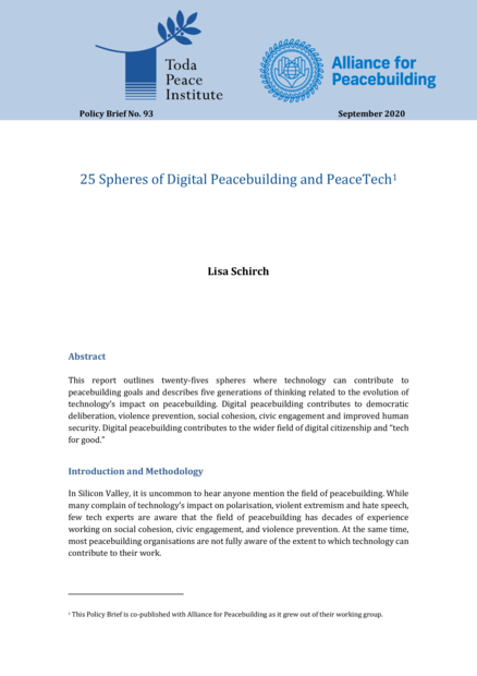 "This report outlines twenty-fives spheres where technology can contribute to peacebuilding goals and describes five generations of thinking related to the evolution of technology’s impact on peacebuilding. Digital peacebuilding contributes to democratic deliberation, violence prevention, social cohesion, civic engagement and improved human security. Digital peacebuilding contributes to the wider field of digital citizenship and “tech for good.” (Abstract)