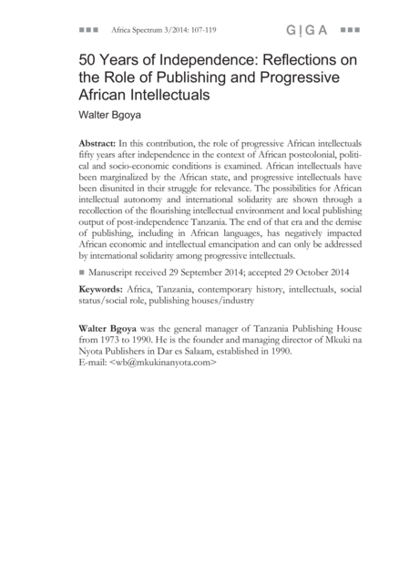 "In this contribution, the role of progressive African intellectuals fifty years after independence in the context of African postcolonial, political and socio-economic conditions is examined. African intellectuals have been marginalized by the African state, and progressive intellectuals have been disunited in their struggle for relevance. The possibilities for African intellectual autonomy and international solidarity are shown through a recollection of the flourishing intellectual environment and local publishing output of post-independence Tanzania. The end of that era and the demise of publishing, including in African languages, has negatively impacted African economic and intellectual emancipation and can only be addressed by international solidarity among progressive intellectuals." (Abstract)