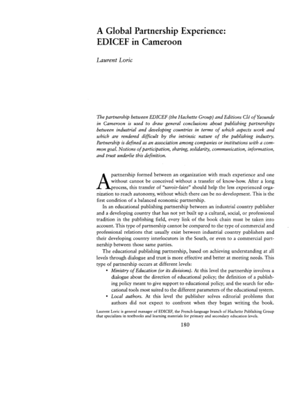 "The partnership between EDICEF (part of the French Hachette Group) and Edition CLE of Yaoundé in Cameroon is used to draw general conclusions about publishing partnerships between industrial and developing countries, examining which aspects work and those that are rendered difficult by the intrinsic nature of the publishing industry." (Hans M. Zell, Publishing, Books & Reading in Sub-Saharan Africa, 3d ed. 2008, nr. 2246)