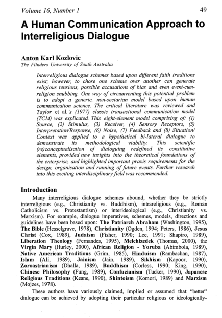 "Interreligious dialogue schemes based upon different faith traditions exist; however, to chose one scheme over another can generate religious tensions, possible accusations of bias and even event-cumreligion snubbing. One way of circumventing this potential problem is to adopt a generic, non-sectarian model based upon human communication science. The critical literature was reviewed and Taylor et al. 's (1977) classic transactional communication model (TCM) was explicated. This eight-element model comprising of (1) Source, (2) Stimulus, (3) Receiver, (4) Sensory Receptors, (5) Interpretation/Response, (6) Noise, (7) Feedback and (8) Situation/Context was applied to a hypothetical bi-lateral dialogue to demonstrate its methodological viability. This scientific (re)conceptualisation of dialoguing redefined its constitutive elements, provided new insights into the theoretical foundations of the enterprise, and highlighted important praxis requirements for the design, organisation and running of future events." (Abstract)