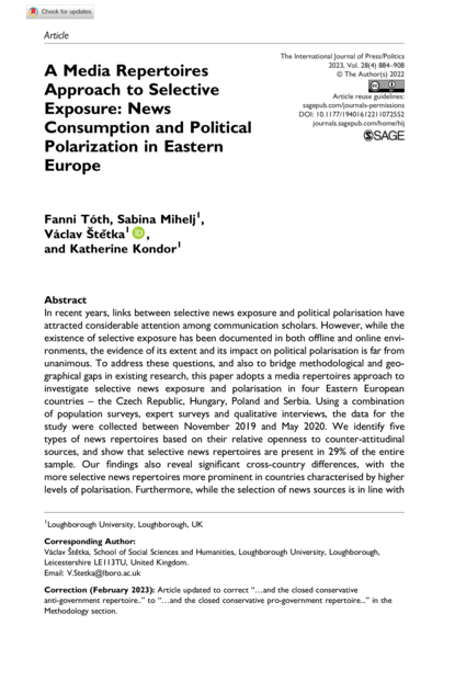 "In recent years, links between selective news exposure and political polarisation have attracted considerable attention among communication scholars. However, while the existence of selective exposure has been documented in both offline and online environments, the evidence of its extent and its impact on political polarisation is far from unanimous. To address these questions, and also to bridge methodological and geographical gaps in existing research, this paper adopts a media repertoires approach to investigate selective news exposure and polarisation in four Eastern European countries – the Czech Republic, Hungary, Poland and Serbia. Using a combination of population surveys, expert surveys and qualitative interviews, the data for the study were collected between November 2019 and May 2020. We identify five types of news repertoires based on their relative openness to counter-attitudinal sources, and show that selective news repertoires are present in 29% of the entire sample. Our findings also reveal significant cross-country differences, with the more selective news repertoires more prominent in countries characterised by higher levels of polarisation. Furthermore, while the selection of news sources is in line with" (Abstract)