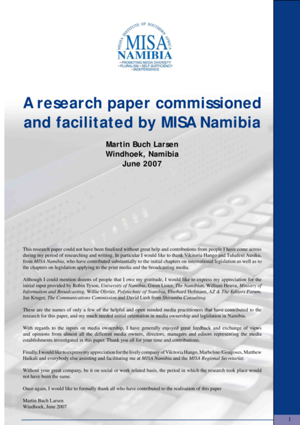 "In order to get a clear picture of the dynamics impacting on the present and future advance of the Namibian media environment - MISA Namibia has with the assistance of Martin Buch Larsen embarked on a comprehensive research to gather information on media ownership and legislation in The Republic of Namibia from 1990 to 2007." (Page 2)