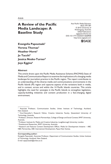 "This article draws upon the Pacific Media Assistance Scheme (PACMAS) State of Media and Communication Report to examine the implications of a changing media landscape for journalism practice in the Pacific region. The report contributes to an understanding of the diverse media and communications environments in the Pacific Islands (PI) region and captures aspects of the variations both in media, and in context, across and within the 14 Pacific Islands countries. This article highlights the need for synergies in the Pacific Islands to strengthen legislation, capacity-building initiatives and content production in a fast-changing digital environment." (Abstract)