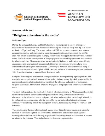 "The monitoring and the analysis carried out for the purpose of this study found out that the media and the institutional channels of mass communication of religious communities have behaved correctly while carrying out their duties, and have established a climate of communication that emits and fosters mutual respect among the faithful, tolerance and harmony that have prevailed the Albanian religious tradition. On the other hand, alongside media institutions of religious communities or organizations operating in the country, the Albanian online world has been infiltrated by a relatively large number of websites which appear to have been created and operated by Islamic religious organizations based in Turkey or other countries in the Middle East. Some of these websites promote schools of Islam that do not match the tradition of the Albanian Islam, and provide a more radical interpretation of the Islamic doctrine. Especially problematic are some websites that promote in Albanian the schools of Salafism and Wahhabism as well as other extremist schools or sects. Meanwhile, the monitoring of the mainstream print and broadcast media in Albania, revealed that they report on religion and activities of religious background mainly during religious festivities, on cases of religiously-motivated clashes or conflicts, on controversial statements regarding religion, its history and religious cohabitation in Albania, as well as cases of scandal and controversy among the ranks of religious authorities." (Page 3)