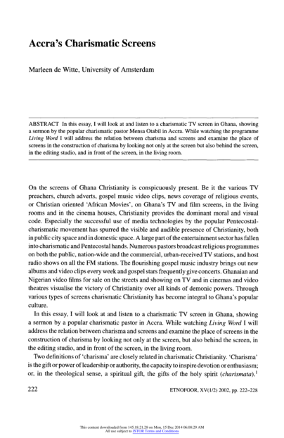 "In this essay, I will look at and listen to a charismatic TV screen in Ghana, showing a sermon by the popular charismatic pastor Mensa Otabil in Accra. While watching the programme Living Word I will address the relation between charisma and screens and examine the place of screens in the construction of charisma by looking not only at the screen but also behind the screen, in the editing studio, and in front of the screen, in the living room." (Abstract)