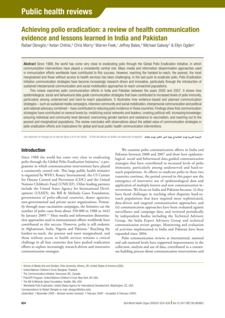 "This review examines polio communication efforts in India and Pakistan between the years 2000 and 2007. It shows how epidemiological, social and behavioural data guide communication strategies that have contributed to increased levels of polio immunity, particularly among underserved and hard-to-reach populations. It illustrates how evidence-based and planned communication strategies – such as sustained media campaigns, intensive community and social mobilization, interpersonal communication and political and national advocacy combined – have contributed to reducing polio incidence in these countries. Findings show that communication strategies have contributed on several levels by: mobilizing social networks and leaders; creating political will; increasing knowledge; ensuring individual and community-level demand; overcoming gender barriers and resistance to vaccination; and reaching out to the poorest and marginalized populations. The review concludes wth observations about the added value of communication strategies in polio eradication efforts and implications for global and local public health communication interventions." (Abstract)