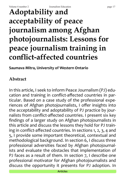 "In this article, I seek to inform Peace Journalism (PJ) education and training in conflict-affected countries in particular. Based on a case study of the professional experiences of Afghan photojournalists, I offer insights into the acceptability and adoptability of PJ practice by journalists from conflict-affected countries. I present six key findings of a larger study on Afghan photojournalists in this article and discuss the lessons they hold for PJ training in conflict-affected countries. In sections 1, 2, 3, 4 and 5, I provide some important theoretical, contextual and methodological background. In section 6, I discuss three professional adversities faced by Afghan photojournalists and evaluate the obstacles that implementation of PJ faces as a result of them. In section 7, I describe one professional motivator for Afghan photojournalists and discuss the opportunity it presents for PJ adoption. In section 8, I describe two other constraints faced by Afghan photojournalists related specifically to donor-funded media development in post-2001 Afghanistan and discuss their implications for PJ training. Finally in section 9, while noting the limitations of the current study, I offer two ways forward for PJ training in conflict-affected countries like Afghanistan." (Abstract)