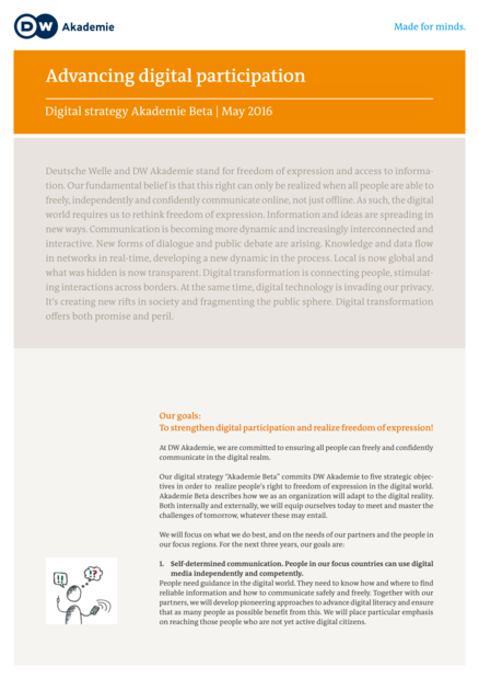 "At DW Akademie, we are committed to ensuring all people can freely and confidently communicate in the digital realm. Our digital strategy “Akademie Beta” commits DW Akademie to five strategic objectives in order to realize people‘s right to freedom of expression in the digital world. Akademie Beta describes how we as an organization will adapt to the digital reality. Both internally and externally, we will equip ourselves today to meet and master the challenges of tomorrow, whatever these may entail. We will focus on what we do best, and on the needs of our partners and the people in our focus regions. For the next three years, our goals are: 1. Self-determined communication. People in our focus countries can use digital media independently and competently [...] 2. Media landscapes of quality. Our partners look to the future of their digital markets [...] 3. Visionary education. Universities, institutions and journalism schools train digital media professionals [...] 4. Digital rights. Our partners make a difference in shaping Internet regulations [...] 5. Innovative dialogue: People use digital tools and platforms to create newpublic spheres." (Pages 1-2)