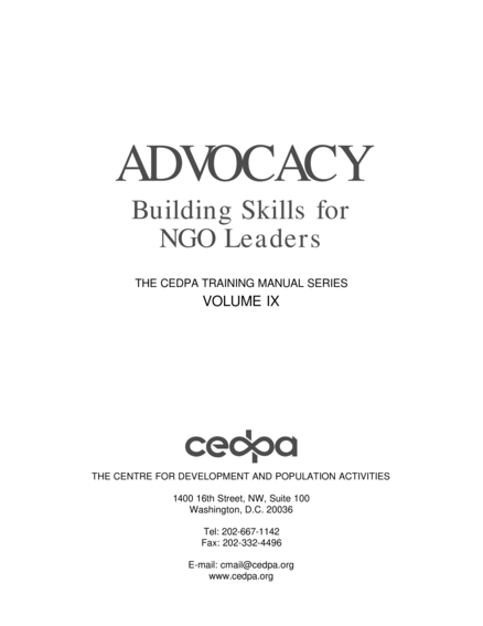 "The manual was written for trainers around the world who seek to improve the advocacy skills of NGO leaders. While much of the background information and role play scenarios deal directly with reproductive health issues, a trainer could adapt the sessions for other contexts. The manual is directed toward trainers with substantial experience and a commitment to participatory methodologies. Less experienced trainers are urged to review Training Trainers for Development: Conducting a Workshop on Participatory Training Techniques (1995)." (Introduction, page 1)