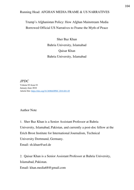 "This study draws from scholarship in framing theory and mediated collective memories for the analysis of the adoption of official narratives of US President Donald Trump’s Afghanistan policy as ready-made news frames by Afghanistan’s Tolo TV’s popular current affairs program as Tawde Khabare (Hot Talks). Collected through purposive sampling technique, a comparative qualitative analysis of selected programs of Tawde Khabare and the text of President Trump’s Afghanistan policy suggests that the post-Taliban US-established Afghan media system has largely adopted and borrowed ready-made news frames and official narratives disseminated by the US government to domestic and global media. The ffindings suggest further that official frames of Donald Trump’s Afghanistan policy received greater acceptability in the Tolo TV coverage of the concerned issue. The study has raised several questions regarding the credibility of the post-Taliban Afghan media system and as do similar systems in other post-conflict societies established though the financial and technical help of the US and allied states after 9/11." (Abstract)