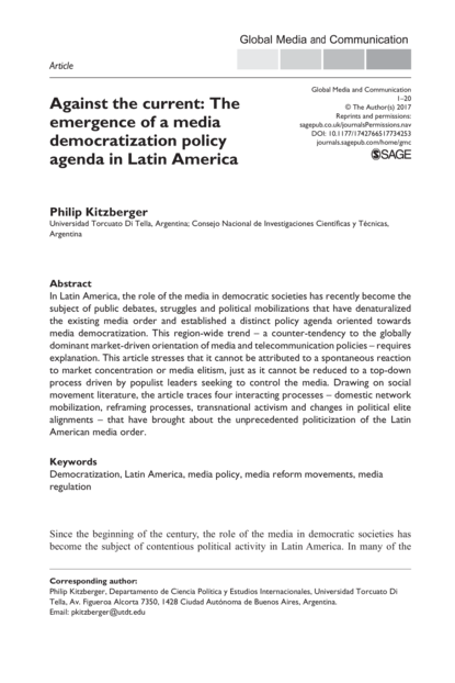 "In Latin America, the role of the media in democratic societies has recently become the subject of public debates, struggles and political mobilizations that have denaturalized the existing media order and established a distinct policy agenda oriented towards media democratization. This region-wide trend – a counter-tendency to the globally dominant market-driven orientation of media and telecommunication policies – requires explanation. This article stresses that it cannot be attributed to a spontaneous reaction to market concentration or media elitism, just as it cannot be reduced to a top-down process driven by populist leaders seeking to control the media. Drawing on social movement literature, the article traces four interacting processes – domestic network mobilization, reframing processes, transnational activism and changes in political elite alignments – that have brought about the unprecedented politicization of the Latin American media order." (Abstract)