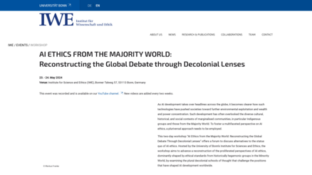 "To foster a multifaceted perspective on AI ethics, a pluriversal approach needs to be employed. This two-day workshop “AI Ethics from the Majority World: Reconstructing the Global Debate Through Decolonial Lenses” offers a forum to discuss alternatives to the status quo of AI ethics. Hosted by the University of Bonn’s Institute for Sciences and Ethics, the workshop aims to advance a reconstruction of the proliferated perspectives of AI ethics, dominantly shaped by ethical standards from historically hegemonic groups in the Minority World, by examining the plural decolonial schools of thought that challenge the positions that have shaped AI development worldwide." (Introduction)