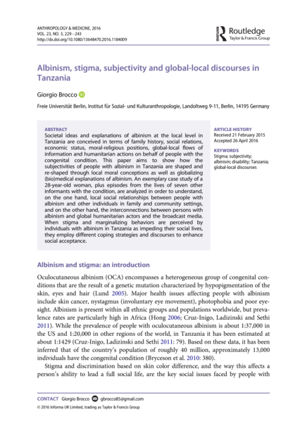 "Societal ideas and explanations of albinism at the local level in Tanzania are conceived in terms of family history, social relations, economic status, moral-religious positions, global-local flows of information and humanitarian actions on behalf of people with the congenital condition. This paper aims to show how the subjectivities of people with albinism in Tanzania are shaped and re-shaped through local moral conceptions as well as globalizing (bio)medical explanations of albinism. An exemplary case study of a 28-year-old woman, plus episodes from the lives of seven other informants with the condition, are analyzed in order to understand, on the one hand, local social relationships between people with albinism and other individuals in family and community settings, and on the other hand, the interconnections between persons with albinism and global humanitarian actors and the broadcast media. When stigma and marginalizing behaviors are perceived by individuals with albinism in Tanzania as impeding their social lives, they employ different coping strategies and discourses to enhance social acceptance." (Abstract)