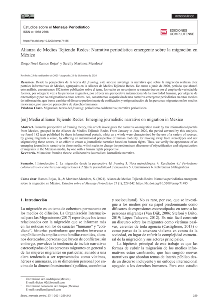 "Desde la perspectiva de la teoría del framing, este artículo investiga la narrativa que sobre la migración realizan diez portales informativos de México, agrupados en la Alianza de Medios Tejiendo Redes. De enero a junio de 2020, periodo que abarcó este análisis, encontramos 182 textos publicados sobre el tema, los cuales en su conjunto se caracterizaron por el empleo de variedad de fuentes, por otorgarle voz a las personas migrantes, por ofrecer una perspectiva internacional de la movilidad humana, por alejarse de estereotipos y por no estigmatizar a estos actores. Así, constatamos la aparición de una narrativa emergente periodística en estos medios de información, que busca cambiar el discurso predominante de cosificación y estigmatización de las personas migrantes en los medios mexicanos, por uno con perspectiva de derechos humanos. Palabras Clave. Migración; teoría del framing; periodismo colaborativo; narrativa periodística." (Resumen)