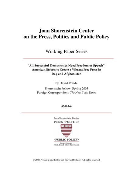 "This paper will examine American efforts to create a vibrant free press in Iraq and Afghanistan. A $200 million project in Iraq was the largest attempt ever by the United States, or any country, to help create independent media in another nation. Run by the Pentagon, it was a near total failure in its first year, with Iraqi journalists, American trainers and U.S. government officials assailing it as wasteful, amateurish and counterproductiv. A far smaller, $15 million State Department effort in Afghanistan, by comparison, appears to have been more effective. In both countries, many local journalists have performed well, particularly when given proper resources and training. But in Iraq and Afghanistan, as well as around the world, murder and violence is now the single largest threat to the creation of an independent news media. Government officials, criminals and terrorists are increasingly using assault and murder to silence the media. Supporting, respecting and, most of all, securing local journalists may be the most critical way the United States can foster the creation of a vibrant free press in Iraq and Afghanistan." (Abstract)