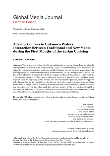 "This paper aims at investigating the relationship between traditional and social media during the first six months of the Syrian uprising. Thanks to direct testimony made available to the author by various cyber activists inside and outside Syria and through constant monitoring of the official propaganda and the coverage of the Syrian events by the two main pan-Arab satellite TVs, this article intends to investigate how both the regime and the activists attempt to represent the “real events on the ground”. In a country where the foreign and pan-Arab press have been mostly expelled since the beginning of the protests and the consequent repression, these two opposite poles heavily fight on the media level. On the one hand, the propaganda dominates traditional media and has sought to show familiarity with new methods, while maintaining the same content and rhetorical tone. On the other hand, the activists, masters of the new media, attempted to overcome the limitations of their tools, aiming at more traditional forms of communication. In both cases, the Internet has emerged as the main weapon of this media confrontation." (Abstract)