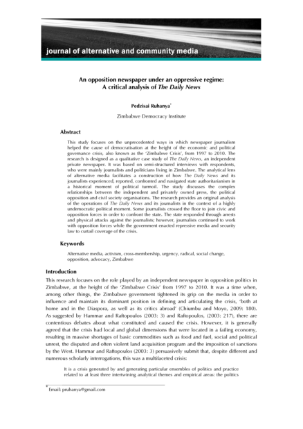 "This study focuses on the unprecedented ways in which newspaper journalism helped the cause of democratisation at the height of the economic and political governance crisis, also known as the ‘Zimbabwe Crisis’, from 1997 to 2010. The research is designed as a qualitative case study of The Daily News, an independent private newspaper. It was based on semi-structured interviews with respondents, who were mainly journalists and politicians living in Zimbabwe. The analytical lens of alternative media facilitates a construction of how The Daily News and its journalists experienced, reported, confronted and navigated state authoritarianism in a historical moment of political turmoil. The study discusses the complex relationships between the independent and privately owned press, the political opposition and civil society organisations. The research provides an original analysis of the operations of The Daily News and its journalists in the context of a highly undemocratic political moment. Some journalists crossed the floor to join civic and opposition forces in order to confront the state. The state responded through arrests and physical attacks against the journalists; however, journalists continued to work with opposition forces while the government enacted repressive media and security law to curtail coverage of the crisis." (Abstract)