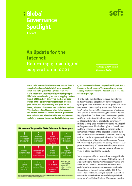"In 2021, the international community has the chance to radically reform global digital governance. The aim should be to guarantee a global, open, free, stable and secure Internet while promoting responsible State behaviour in cyberspace. Mapping the two strands of this policy – improving models for cooperation on the collective development of Internet governance, and implementing the cyber norms already adopted – is a matter for the United Nations (UN). A reformed architecture for digital cooperation has the potential to make Internet governance more inclusive and effective, while new mechanisms can help to advance the currently divided debate on cyber norms and enhance the predictability of State behaviour in cyberspace." (Page 1)