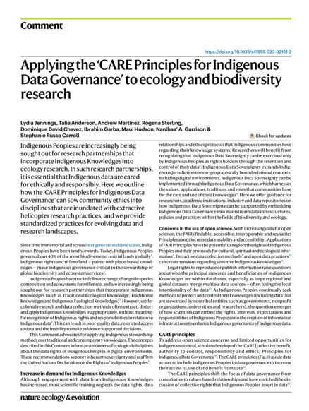 "Indigenous Peoples are increasingly being sought out for research partnerships that incorporate Indigenous Knowledges into ecology research. In such research partnerships, it is essential that Indigenous data are cared for ethically and responsibly. Here we outline how the ‘CARE Principles for Indigenous Data Governance’ can sow community ethics into disciplines that are inundated with extractive helicopter research practices, and we provide standardized practices for evolving data and research landscapes." (Abstract)