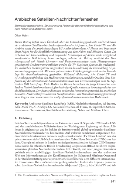 "Dieser Beitrag liefert einen Überblick über die Entwicklungsgeschichte und Strukturen der arabischen Satelliten-Nachrichtenfernsehsender Al-Jazeera, Abu Dhabi TV und Al-Arabiya sowie des arabischsprachigen US-Auslandsfernsehens Al-Hurra und fragt nach ihren Folgen für die Konfliktberichterstattung aus dem Nahen und Mittleren Osten. Da Arbeiten zur Theoriebildung und empirische Erhebungen auf diesem noch weitgehend unerforschten Feld bislang kaum vorliegen, arbeitet der Beitrag zunächst den Forschungsstand auf. Mittels Literatur- und Dokumentenanalyse sowie Hintergrundgesprächen mit Senderverantwortlichen werden die TV-Stationen dann in die traditionellen arabischen Mediensysteme eingeordnet, wobei besonders auf die Entwicklung Al-Jazeeras eingegangen wird. Mit einer systematischen Objekttypologie wird so eine Grundlage für Anschlussforschung geschaffen. Während Al-Jazeera, Abu Dhabi TV und Al-Arabiya zweifelsohne den Medienorient revolutionierten, wird die Qualität ihres Einflusses auf die internationale Kommunikation nach den Terroranschlägen vom 11. September 2001 hinterfragt. Viele Medien im Westen betrachten die junge Generation arabischen Nachrichtenfernsehens als glaubwürdige Quelle, nutzen sie überwiegend aber nur als Bilderlieferant. Der Beitrag diskutiert zudem das Innovationspotenzial des arabischen Satelliten-Nachrichtenfernsehens im Transformations- und Demokratisierungsprozess auf dem Weg zu einer modernisierten und professionalisierten arabischen Medienwelt." (Abstract)