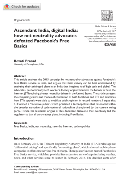 "This article analyzes the 2015 campaign by net neutrality advocates against Facebook’s Free Basics service in India, and argues that their victory can be best understood by analyzing their privileged place in an India that imagines itself high tech and global. The advocates, predominantly tech workers, loosely organized under the banner of Save the Internet (STI) echoing the net neutrality debate in the United States. The article assesses the competing claims and modes of contention of both Facebook and STI, and examines how STI’s appeals were able to mobilize public opinion in record numbers. I argue that STI formed a ‘recursive public’, which practiced a technopolitics that resonated within the broader narrative of technocultural nationalism championed by the current ruling party. I trace the historical origins of this dominant discourse that eventually led the regulator to ban all zero-ratings plans, including Free Basics." (Abstract)