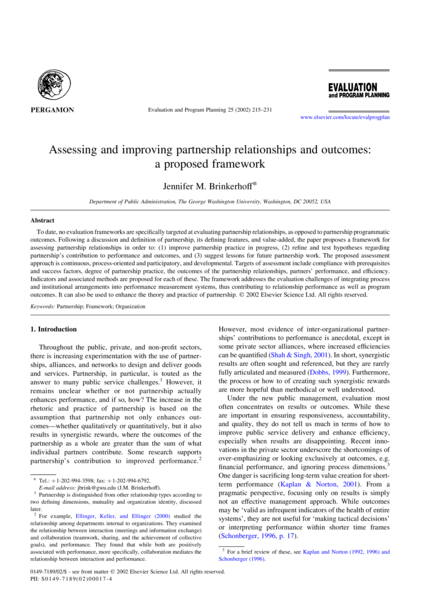 "To date, no evaluation frameworks are specifically targeted at evaluating partnership relationships, as opposed to partnership programmatic outcomes. Following a discussion and definition of partnership, its defining features, and value-added, the paper proposes a framework for assessing partnership relationships in order to: (1) improve partnership practice in progress, (2) refine and test hypotheses regarding partnership’s contribution to performance and outcomes, and (3) suggest lessons for future partnership work. The proposed assessment approach is continuous, process-oriented and participatory, and developmental. Targets of assessment include compliance with prerequisites and success factors, degree of partnership practice, the outcomes of the partnership relationships, partners’ performance, and efficiency. Indicators and associated methods are proposed for each of these. The framework addresses the evaluation challenges of integrating process and institutional arrangements into performance measurement systems, thus contributing to relationship performance as well as program outcomes. It can also be used to enhance the theory and practice of partnership." (Abstract)