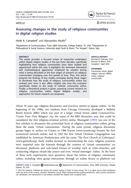 "This article provides a focused review of researches undertaken within Digital religion studies in the last three decades, specifically highlighting how religious communities have been studied and approached within this area. It highlights the dominant theoretical and methodological approaches employed by scholars during what is being described as the four stages of research on religious communities emerging over this period of time. Thus, this article presents the findings of key studies emerging during these stages to illuminate how the study of religious communities online has evolved over time. It also offers insights into how this evolution specifically relates to the study of Catholic community online. Finally, a theoretical analysis is given, assessing current research on religious communities within Digital Religion studies, and approaches for future research are proposed." (Abstract)