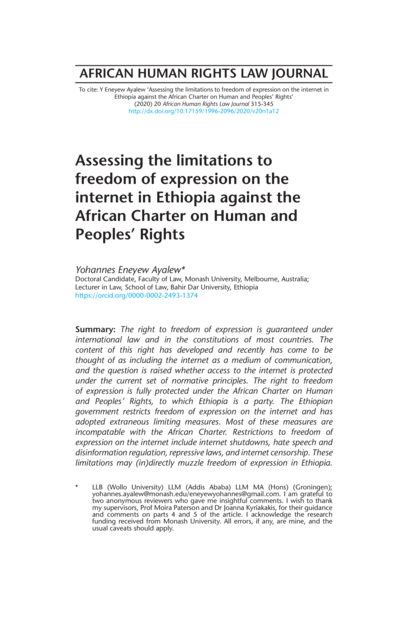 "The Ethiopian government restricts freedom of expression on the internet and has adopted extraneous limiting measures. Most of these measures are incompatable with the African Charter. Restrictions to freedom of expression on the internet include internet shutdowns, hate speech and disinformation regulation, repressive laws, and internet censorship. These limitations may (in)directly muzzle freedom of expression in Ethiopia. The writer argues that illegitimate limitations of the right fall short of the quadruple tests of limitation measures, both under the African Charter and the Ethiopian Constitution. As a result, these limitations violate individuals’ freedom of expression on the internet. Finally, the article suggests that the Ethiopian government should draw guidance from the African Commission’s 2019 Declaration on Freedom of Expression and Access to Information containing rules on limitation measures imposed on freedom of expression on the internet." (Summary)