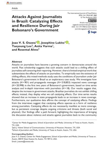 "Attacks on journalists have become a growing concern in democracies around the world. Past scholarship suggests that such attacks could lead to a chilling effect of journalists self-censoring their reporting. However, there is limited empirical work that substantiates the effects of attacks on journalists. To empirically test the existence of chilling effects, this mixed-methods study uses the conditions of journalism under Jair Bolsonaro’s government in Brazil as an exploratory case study. We investigate how attacks (N = 901) and propaganda messages (N = 518,853) impacted news coverage (N = 20,998) in the first two years of Bolsonaro’s government, based on time series analysis and in-depth interviews with journalists (N = 18). Our results suggest that, despite the increase in government attacks, Brazilian journalists do not exhibit chilling effects; instead, they display what we call catalyzing effects. Our time series results showed that an increase in state propaganda leads to an increase in news coverage. Furthermore, our qualitative data affirms the concept of catalyzing effects. Findings from the interviews suggest that catalyzing effects operate as a form of resilience among journalists. Catalyzing effects do not necessarily manifest as more coverage, but as persistent coverage despite ongoing criticisms and threats (both social and physical). Our findings offer a path forward, highlighting the importance of bringing the discussion about violence and attacks against journalists back to the community of journalists experiencing this hostility. Network support, journalists said, has been crucial, which points to the need for a solidarity infrastructure that supports journalists’ constructive role in society.(Abstract)
