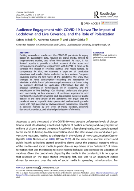 "Existing research on media and the COVID-19 pandemic is largely based on quantitative data, focused on digital media, limited to single-country studies, and often West-centred. As such, it has limited capacity to provide a holistic account of the causes and consequences of audience engagement with COVID-19 news, or to consider the impact of systemic political and media factors. To compensate for that, we examine a large set of qualitative interviews and media diaries collected in four eastern European countries during the first wave of the pandemic. We show that changes in news consumption—including the resurgence of television and decline of print consumption—were not driven solely by audience demand for up-to-date information, but also by practical constrains of home-bound life in lockdown, and the introduction of live briefings. Our findings underscore disruption and uncertainty as key elements of audience experiences and highlight the markedly privatized and depoliticized nature of public debate in the early phase of the pandemic. We argue that the pandemic was an unpredictable, open-ended, and exhausting media event with high potential for divisiveness and polarization, especially in contexts marked by low levels of media freedom, declining democratic standards, and elite-led politicization of the crisis." (Abstract)