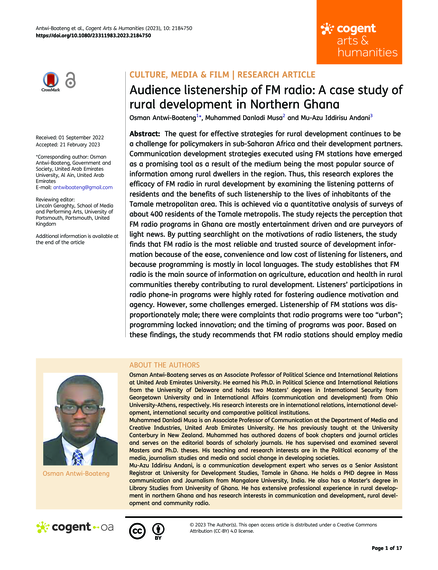 "The quest for effective strategies for rural development continues to be a challenge for policymakers in sub-Saharan Africa and their development partners. Communication development strategies executed using FM stations have emerged as a promising tool as a result of the medium being the most popular source of information among rural dwellers in the region. Thus, this research explores the efficacy of FM radio in rural development by examining the listening patterns of residents and the benefits of such listenership to the lives of inhabitants of the Tamale metropolitan area. This is achieved via a quantitative analysis of surveys of about 400 residents of the Tamale metropolis. The study rejects the perception that FM radio programs in Ghana are mostly entertainment driven and are purveyors of light news. By putting searchlight on the motivations of radio listeners, the study finds that FM radio is the most reliable and trusted source of development information because of the ease, convenience and low cost of listening for listeners, and because programming is mostly in local languages. The study establishes that FM radio is the main source of information on agriculture, education and health in rural communities thereby contributing to rural development. Listeners’ participations in radio phone-in programs were highly rated for fostering audience motivation and agency. However, some challenges emerged. Listenership of FM stations was disproportionately male; there were complaints that radio programs were too “urban”; programming lacked innovation; and the timing of programs was poor. Based on these findings, the study recommends that FM radio stations should employ media" (Abstract)