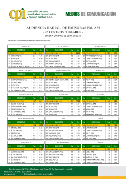 Audiencia radial de emisoras FM/AM: 25 centros poblados