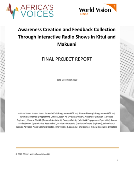"Using interactive radio dialogues, AVF aims to contribute towards the achievement of World Vision Kenya’s (WVK) Emergency Response in Kitui and Makueni counties project (July-December 2020). More specifically, Africa’s Voices deployed its interactive radio methodology to achieve the following objectives: 1. At the beginning of the project, gather information on Knowledge Attitude and Practices among Community members in Kitui and Makueni Counties on COVID- 19; 2. At the end of the Project, gather information on Knowledge Attitude and Practices among Community members in Kitui and Makueni Counties on COVID 19 to compare with initial information gathered at the beginning of the project; 3. Participate in the evaluation of the project effectiveness at the end of the six-month project intervention as may be established by WVK. This report presents the findings from the first two phases of this project, captured under Objective 1 above." (Introduction, page 6)