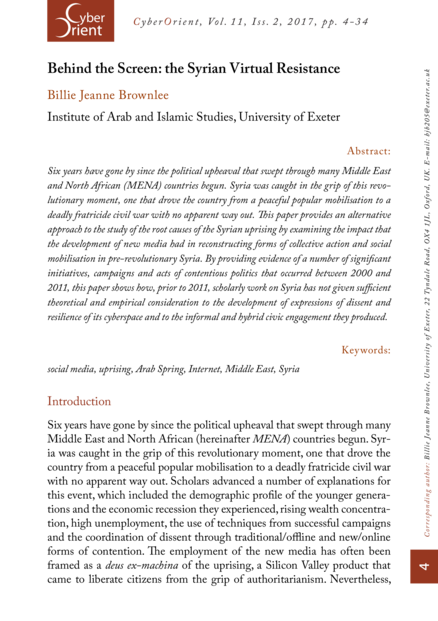 "Six years have gone by since the political upheaval that swept through many Middle East and North African (MENA) countries begun. Syria was caught in the grip of this revolutionary moment, one that drove the country from a peaceful popular mobilisation to a deadly fratricide civil war with no apparent way out. This paper provides an alternative approach to the study of the root causes of the Syrian uprising by examining the impact that the development of new media had in reconstructing forms of collective action and social mobilisation in pre-revolutionary Syria. By providing evidence of a number of significant initiatives, campaigns and acts of contentious politics that occurred between 2000 and 2011, this paper shows how, prior to 2011, scholarly work on Syria has not given sufficient theoretical and empirical consideration to the development of expressions of dissent and resilience of its cyberspace and to the informal and hybrid civic engagement they produced." (Abstract)