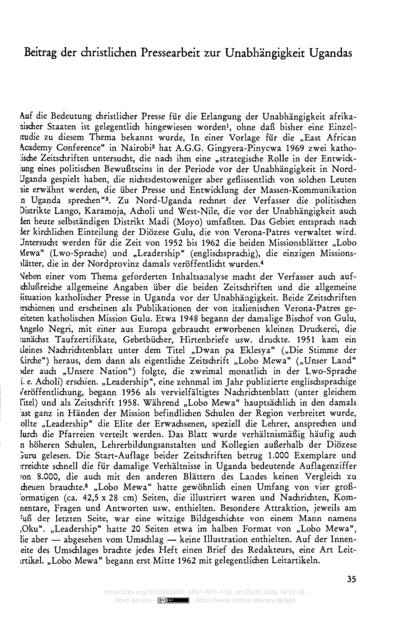 "In einer Vorlage für die „East African Academy Conference" in Nairobi hat A.G.G. Gingyera-Pinycwa 1969 zwei katholische Zeitschriften untersucht, die nach ihm eine „strategische Rolle in der Entwicklung eines politischen Bewußtseins in der Periode vor der Unabhängigkeit in Nord-Uganda gespielt haben, die nichtsdestoweniger aber geflissentlich von solchen Leuten nie erwähnt werden, die über Presse und Entwicklung der Massen-Kommunikation in Uganda sprechen. Zu Nord-Uganda rechnet der Verfasser die politischen Distrikte Lango, Karamoja, Acholi und West-Nile, die vor der Unabhängigkeit auch den heute selbständigen Distrikt Madi (Moyo) umfaßten. Das Gebiet entsprach nach der kirchlichen Einteilung der Diözese Gulu, die von Verona-Patres verwaltet wird. Untersucht werden für die Zeit von 1952 bis 1962 die beiden Missionsblätter „Lobo Mewa" (Lwo-Sprache) und „Leadership" (englischsprachig), die einzigen Missionsblätter, die in der Nordprovinz damals veröffentlicht wurden. Neben einer vom Thema geforderten Inhaltsanalyse macht der Verfasser auch aufschlußreiche allgemeine Angaben über die beiden Zeitschriften und die allgemeine Situation katholischer Presse in Uganda vor der Unabhängigkeit. Beide Zeitschriften erschienen und erscheinen als Publikationen der von italienischen Verona-Patres geleiteten katholischen Mission Gulu." (Seite 35)