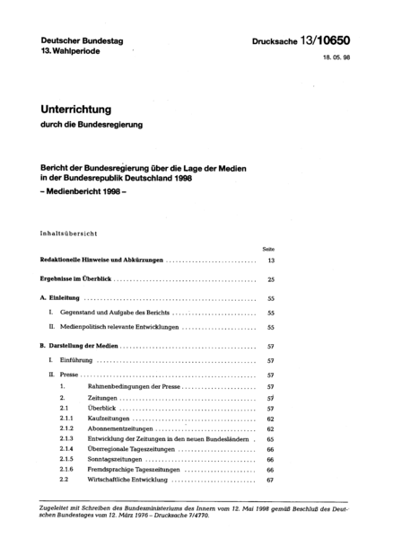 Bericht der Bundesregierung über die Lage der Medien in der Bundesrepublik Deutschland 1998 - Medienbericht 1998: Unterrichtung durch die Bundesregierung. Deutscher Bundestag, Drucksache 13/10650 vom 18. Mai 1998