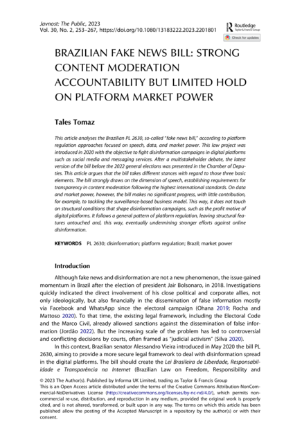 "This article analyses the Brazilian PL 2630, so-called “fake news bill,” according to platform regulation approaches focused on speech, data, and market power. This law project was introduced in 2020 with the objective to fight disinformation campaigns in digital platforms such as social media and messaging services. After a multistakeholder debate, the latest version of the bill before the 2022 general elections was presented in the Chamber of Deputies. This article argues that the bill takes different stances with regard to those three basic elements. The bill strongly draws on the dimension of speech, establishing requirements for transparency in content moderation following the highest international standards. On data and market power, however, the bill makes no significant progress, with little contribution, for example, to tackling the surveillance-based business model. This way, it does not touch on structural conditions that shape disinformation campaigns, such as the profit motive of digital platforms. It follows a general pattern of platform regulation, leaving structural features untouched and, this way, eventually undermining stronger efforts against online disinformation." (Abstract)