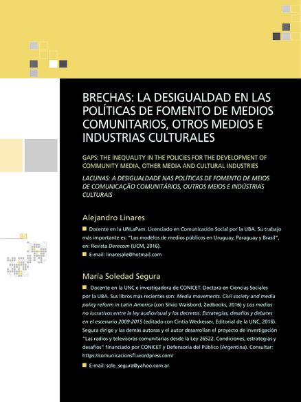 "En este artículo se analiza en qué medida las políticas públicas de comunicación y cultura fueron uno de los factores fundamentales que contribuyeron para construir la posición de profunda desventaja en términos de sostenibilidad económica de los medios comunitarios, populares y alternativos de Argentina con respecto a los medios de propiedad privada con fines de lucro, a los de propiedad estatal y a otras industrias culturales. Se pretende demostrar que estos medios, en comparación con medios privados y estatales y con otras industrias culturales, se han desarrollado en históricas condiciones de desigualdad que perjudicaron sus posibilidades de sostenibilidad económica en el tiempo." (Abstract)