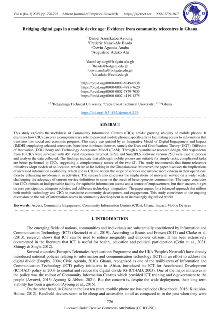 "This study explores the usefulness of Community Information Centres (CICs) amidst growing ubiquity of mobile phones. It examines how CICs can play a complementary role to personal mobile phones, specifically in facilitating access to information that translates into social and economic progress. This study was guided by an Integrative Model of Digital Engagement and Impact (IMDEI) employing selected constructs from three dominant theories namely the Uses and Gratifications Theory (UGT), Diffusion of Innovation (DOI) theory and Technology Acceptance Model (TAM). Through a quantitative research design, 500 respondents from 10 CICs were surveyed with 451 valid responses returned. SPSS and SmartPLS software version 25.0 were used to process and analyse the data collected. The findings indicate that although mobile phones are suitable for simple tasks, complicated tasks are better performed in CICs, suggesting a complementary nature of the two (2). The study recommends that future telecentre initiatives adopt models of co-location, which are so far lacking in the Ghanaian case. Moreover, the paper discusses the implications of increased information availability, which allows CICs to widen the scope of services and involve more citizens in their operations, thereby enhancing involvement in activities. The research also discusses the implications of universal service on a wider scale, challenging the adequacy of current service definitions to cater to the needs of heterogeneous communities. The paper concludes that CICs remain an indispensable facility for equitable information access and a source of empowerment, but their success hinges on user participation, adequate policies, and deliberate technology integration. The paper argues for a balanced approach that utilises both mobile technology and CICs to maximize community development and engagement. This study contributes to the ongoing discussion on the role of information access in community development in an increasingly digitalised world." (Abstract)