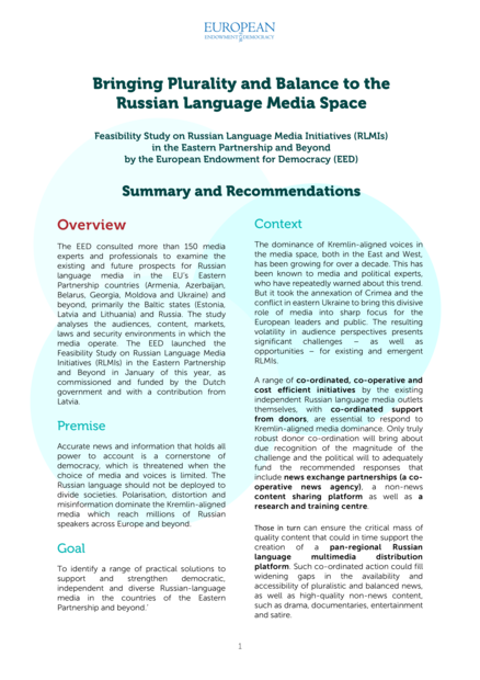 Bringing Plurality and Balance to the Russian Language Media Space: Feasibility Study on Russian Language Media Initiatives (RLMIs) in the Eastern Partnership and Beyond. Summary and Recommendations