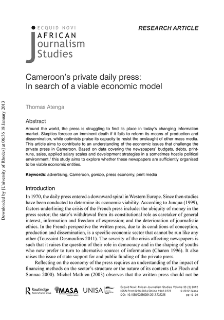 "Around the world, the press is struggling to find its place in today's changing information market. Skeptics foresee an imminent death if it fails to reform its means of production and dissemination, while optimists praise its capacity to resist the onslaught of other mass media. This article aims to contribute to an understanding of the economic issues that challenge the private press in Cameroon. Based on data covering the newspapers’ budgets, debts, print-runs, sales, applied salary scales and development strategies in a sometimes hostile political environment, this study aims to explore whether these newspapers are sufficiently organised to be viable economic entities." (Abstract)