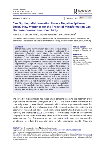 "In the battle against misinformation, do negative spillover effects of communicative efforts intended to protect audiences from inaccurate information exist? Given the relatively limited prevalence of misinformation in people’s news diets, this study explores if the heightened salience of misinformation as a persistent societal threat can have an unintended spillover effect by decreasing the credibility of factually accurate news. Using an experimental design (N = 1305), we test whether credibility ratings of factually accurate news are subject to exposure to misinformation, corrective information, misinformation warnings, and news media literacy (NML) interventions relativizing the misinformation threat. Findings suggest that efforts like warning about the threat of misinformation can prime general distrust in authentic news, hinting toward a deception bias in the context of fear of misinformation being salient. Next, the successfulness of NML interventions is not straight forward if it comes to avoiding that the salience of misinformation distorts people’s creditabilityaccuracy. We conclude that the threats of the misinformation order may not just be remedied by fighting false information, but also by reestablishing trust in legitimate news." (Abstract)