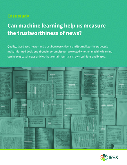 "IREX partnered with Lore.Ai to test whether machine learning software can automatically detect news articles that contains journalists’ own opinions. This matters because impartial, fact-based news is a powerful indicator for the quality of media and the vibrancy of an information ecosystem. A team of professional media evaluators trained machine learning software to find examples of news articles that contain opinions from a body of over 1,200 online Mozambican news articles. The software identified articles that contained opinions with 95% accuracy. This accuracy was achieved after only 16 rounds of training the software, and anecdotes from the team suggest that the software’s accuracy noticeably improved after only about 20 minutes of “training”. The results have promising implications to improve efficiency, scale, and consistency of traditionally manual and time-consuming media monitoring efforts, such as helping projects target resources more effectively to support journalists whose articles are flagged by the software. The process also surfaced valuable lessons about limitations of applying machine learning to monitoring, evaluation, and learning (MEL) in global development contexts, such as reinforcing human bias or the need to invest in indigenous machine learning talent to apply these tools sustainably. The experiment was implemented in Mozambique, where IREX’s Media Strengthening Program (MSP, funded by the United States Agency for International Development) supports Mozambican professional and community journalists and their media platforms to provide high quality information to citizens." (Key findings, page 1)