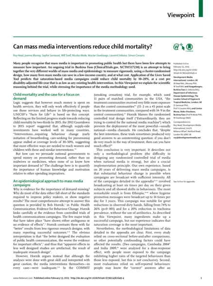 "Many people recognise that mass media is important in promoting public health but there have been few attempts to measure how important. An ongoing trial in Burkina Faso (ClinicalTrials.gov, NCT01517230) is an attempt to bring together the very different worlds of mass media and epidemiology: to measure rigorously, using a cluster-randomised design, how many lives mass media can save in a low-income country, and at what cost. Application of the Lives Saved Tool predicts that saturation-based media campaigns could reduce child mortality by 10–20%, at a cost per disability-adjusted life-year that is as low as any existing health intervention. In this Viewpoint we explain the scientific reasoning behind the trial, while stressing the importance of the media methodology used." (Abstract)