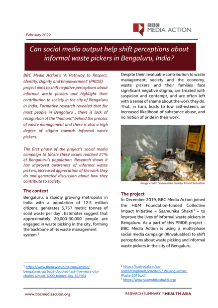 "Bengaluru […] generates 5,757 metric tonnes of solid waste per day. Estimates suggest that approximately 20,000-30,000 people are engaged in waste picking in the city. BBC Media Action's 'A Pathway to Respect, Identity, Dignity and Empowerment' (PRIDE) project aims to shift negative perceptions about informal waste pickers and highlight their contribution to society in the city of Bengaluru in India. The first phase of the project's social media campaign to tackle these issues reached 21% of Bengaluru's population. Research shows it has improved awareness of informal waste pickers, increased appreciation of the work they do and generated discussion about how they contribute to society." (Page 1)