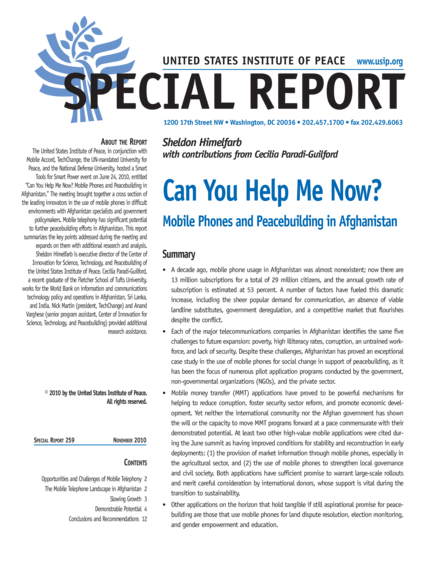 "A decade ago, mobile phone usage in Afghanistan was almost nonexistent; now there are 13 million subscriptions for a total of 29 million citizens, and the annual growth rate of subscription is estimated at 53 percent. A number of factors have fueled this dramatic increase, including the sheer popular demand for communication, an absence of viable landline substitutes, government deregulation, and a competitive market that flourishes despite the conflict. Each of the major telecommunications companies in Afghanistan identifies the same five challenges to future expansion: poverty, high illiteracy rates, corruption, an untrained workforce, and lack of security. Despite these challenges, Afghanistan has proved an exceptional case study in the use of mobile phones for social change in support of peacebuilding, as it has been the focus of numerous pilot application programs conducted by the government, non-governmental organizations (NGOs), and the private sector. Mobile money transfer (MMT) applications have proved to be powerful mechanisms for helping to reduce corruption, foster security sector reform, and promote economic development. Yet neither the international community nor the Afghan government has shown the will or the capacity to move MMT programs forward at a pace commensurate with their demonstrated potential. At least two other high-value mobile applications were cited during the June summit as having improved conditions for stability and reconstruction in early deployments: (1) the provision of market information through mobile phones, especially in the agricultural sector, and (2) the use of mobile phones to strengthen local governance and civil society. Both applications have sufficient promise to warrant large-scale rollouts and merit careful consideration by international donors, whose support is vital during the transition to sustainability." (Summary)