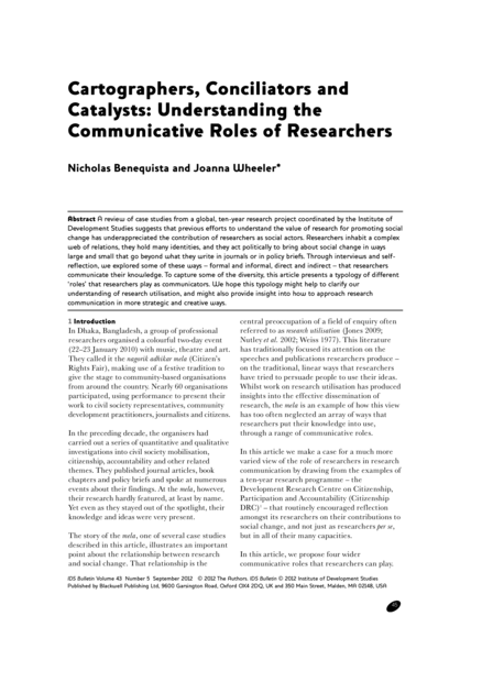 "A review of case studies from a global, ten-year research project coordinated by the Institute of Development Studies suggests that previous efforts to understand the value of research for promoting social change has underappreciated the contribution of researchers as social actors. Researchers inhabit a complex web of relations, they hold many identities, and they act politically to bring about social change in ways large and small that go beyond what they write in journals or in policy briefs. Through interviews and self-reflection, we explored some of these ways – formal and informal, direct and indirect – that researchers communicate their knowledge. To capture some of the diversity, this article presents a typology of different ‘roles’ that researchers play as communicators. We hope this typology might help to clarify our understanding of research utilisation, and might also provide insight into how to approach research communication in more strategic and creative ways." (Abstract)