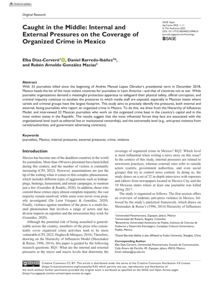 "With 33 journalists killed since the beginning of Andrés Manuel López Obrador’s presidential term in December 2018, Mexico heads the list of the most violent countries for journalists in Latin America—and that of countries not at war. While journalist organizations demand a meaningful protection apparatus to safeguard their physical safety, official corruption, and criminal impunity continue to escalate the pressures to which media staff are exposed, especially in Mexican states where cartels and criminal groups have the largest footprint. This study aims to precisely identify the pressures, both internal and external, facing journalists who report on organized crime in Mexico. To do this, we drew from the Hierarchy of Influences Model, and interviewed 22 Mexican journalists who work on the organized crime beat in the country’s capital and in the most violent states in the Republic. The results suggest that the most influential forces they face are associated with the organizational level (such as editorial line or institutional censorship), and the extramedia level (e.g., anti-press violence from cartels/authorities, and government advertising contracts)." (Abstract)